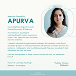 Apurva is a counseling psychologist, certified career counselor, and the founder of Ahaituki Counseling & Well-being. Through her practice, she offers mental health counseling as well as career counseling, providing a compassionate and supportive space for individuals at important turning points in life. In the area of career counseling, she works with students as well as professionals who feel uncertain about the right career path, subject, or course for them, helping them arrive at choices that truly fit their strengths and aspirations. She does not provide study abroad guidance, college selection/admissions services, job search support, or NEET counseling - her focus is solely on helping people discover the direction best suited to them. Her services are most helpful for those seeking to explore "which direction to choose," rather than logistical or placement-based guidance.